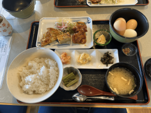 注文は「にわとり定食」。11種類(この日は10種類)の卵を食べ放題の「卵かけご飯」です。