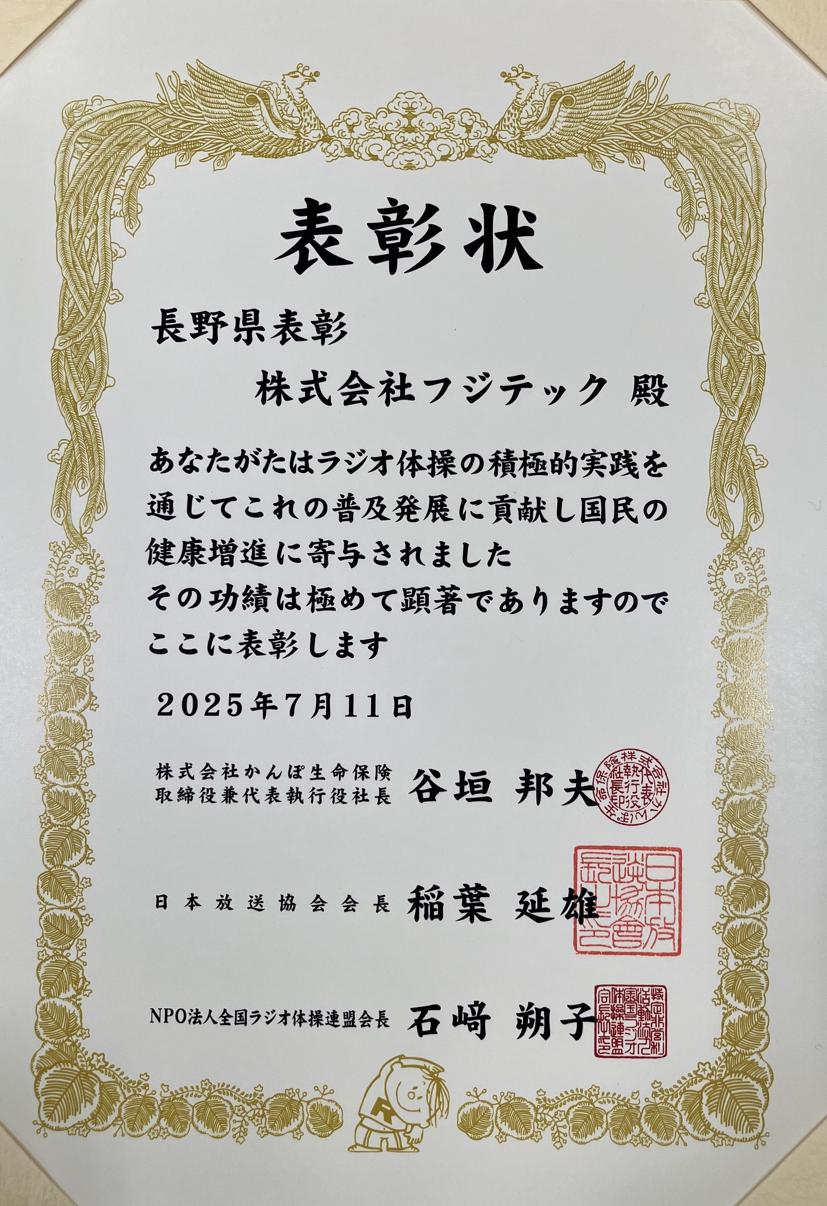 2020年より継続しており、習慣化の功績が認められ、全国ラジオ体操連盟より表彰を受けました。